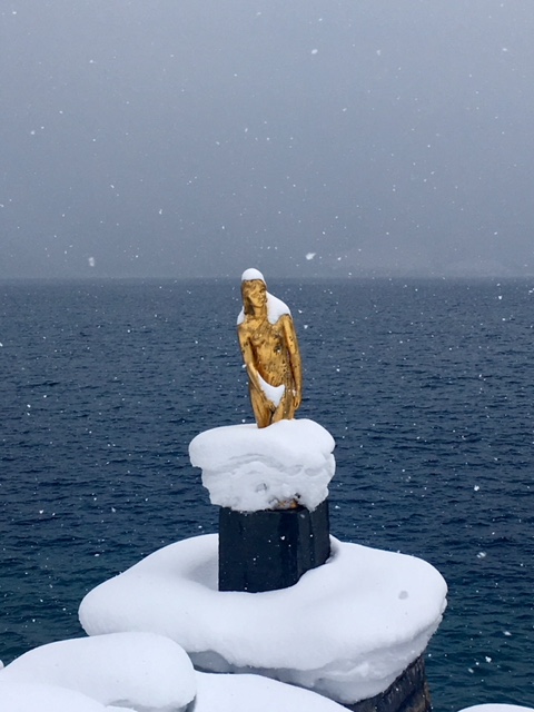 雪の積もった田沢湖の たつこ像 死ぬまでに行きたい 世界の絶景