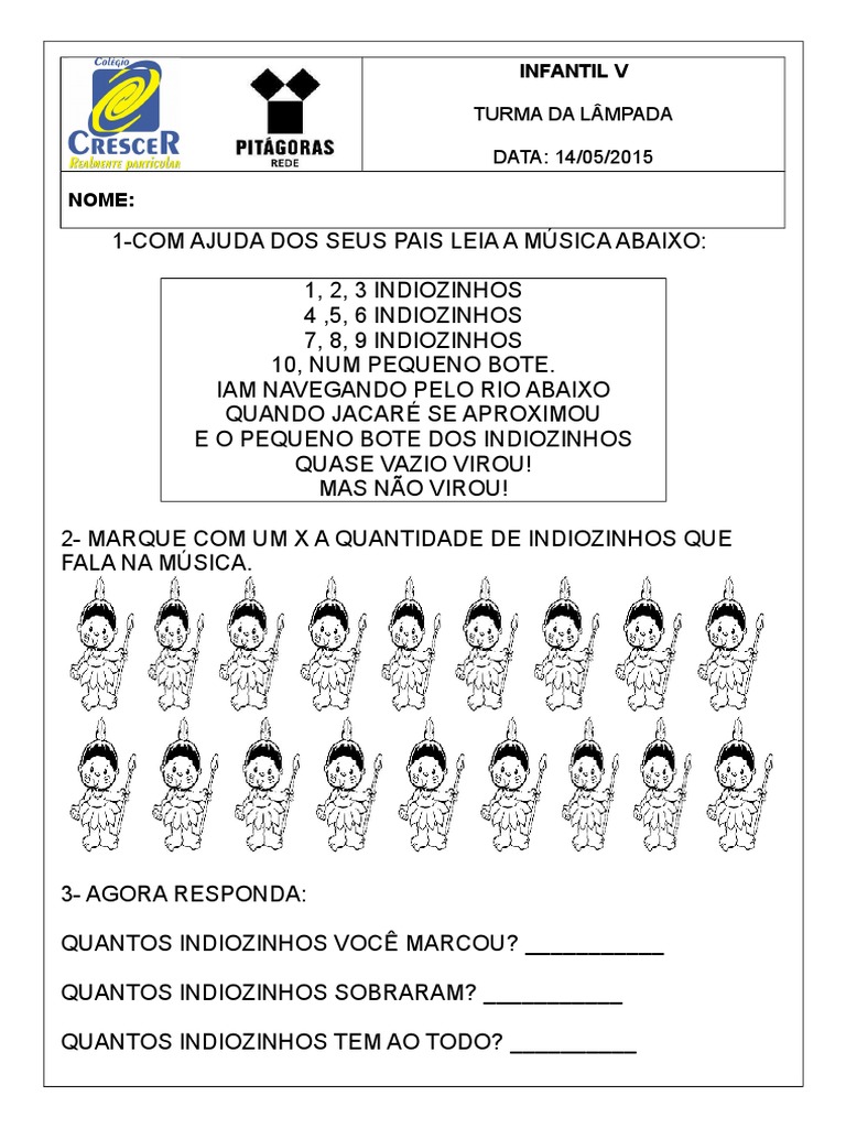 Escola Magia De Sonhos 1 2 3 Indiozinhos 4 5 6 Indiozinhos 7 8 9 10 Indiozinhos Num Pequeno Bote
